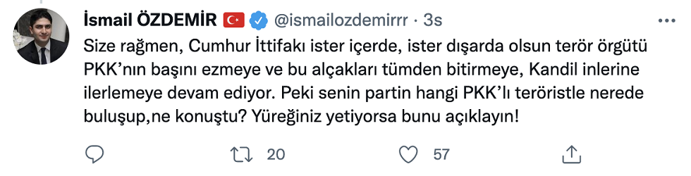 “Sayın Çetin Arık, bu fotoğrafa çok iyi bak! Partin CHP, Kayseri’nin göbeğinde bu alçak ve kahpece saldırıyı düzenleyen terör örgütü PKK uzantısı HDP’yi meşru görüyor, mecliste olsun istiyor! Kayseri, kendisine ve Atatürk’e ihanet eden partin CHP’yi affetmeyecek! Size rağmen, Cumhur ittifakı ister içerde, ister dışarda olsun terör örgütü PKK’nın başını ezmeye ve bu alçakları tümden bitirmeye, Kandil inlerine ilerlemeye devam ediyor. Peki senin partin hangi PKK’lı teröristle nerede buluşup, ne konuştu? Yüreğiniz yetiyorsa bunu açıklayın!.”